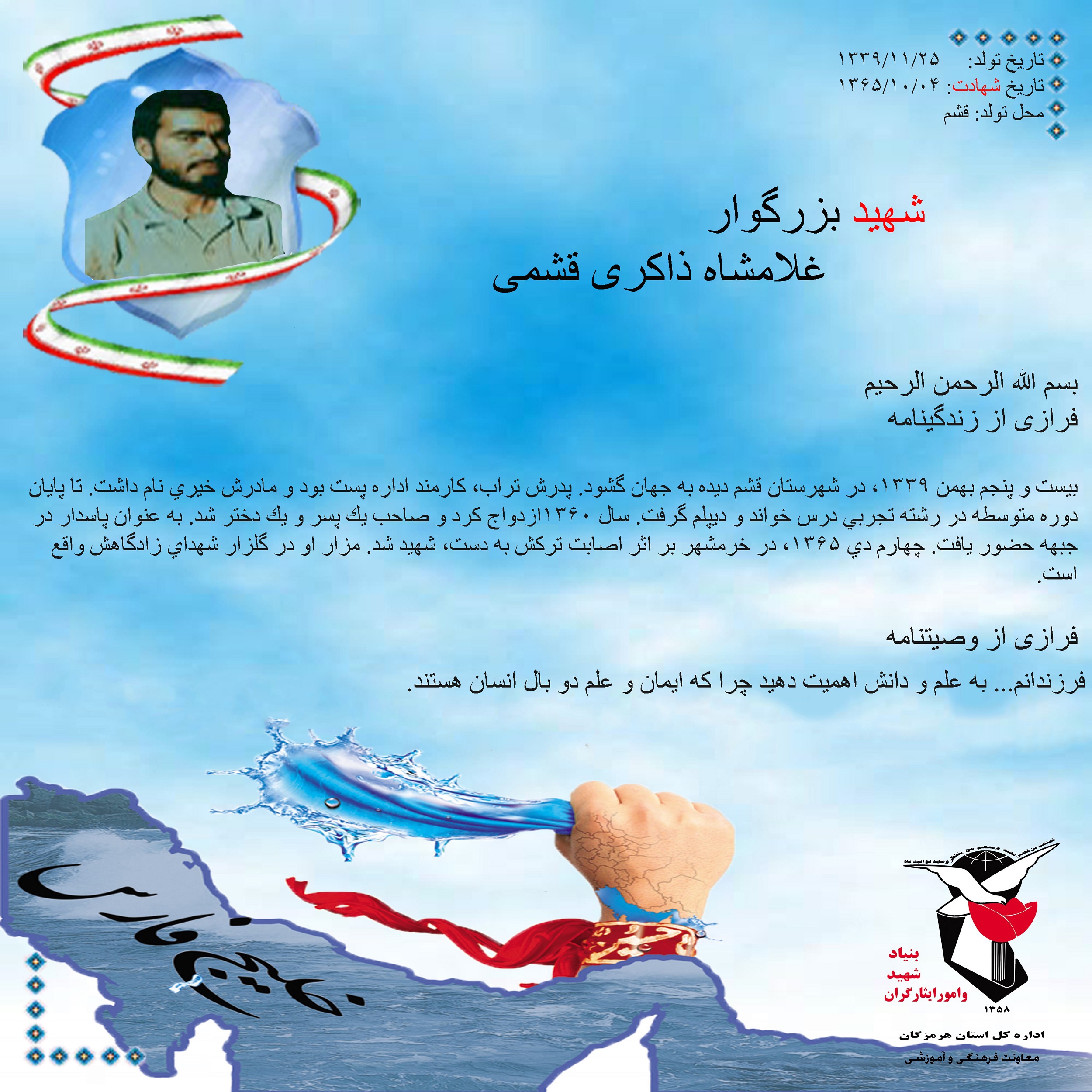 فرازی از زندگینامه و وصیتنامه شهید بزرگوار غلامشاه ذاکری قشمی