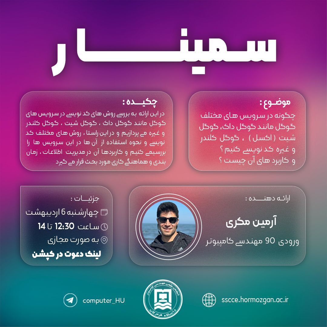 در این ارائه به بررسی روش های کد نویسی در سرویس های گوگل مانند گوگل داک ، گوگل شیت ، گوگل کلندر و غیره می پردازیم و در این راستا ، روش های مختلف کد نویسی و نحوه استفاده از آن ها در این سرویس ها را بررسی می کنیم و کاربردهای آن در مدیریت اطلاعات، زمان بندی و هماهنگی کاری مورد بحث قرار می گیرد.